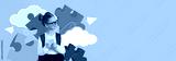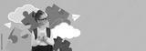 A young child stands with a backpack, holding a smartphone and looking inspired. Bright puzzle pieces and clouds create a vibrant school-themed background, celebrating creativity and learning.