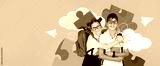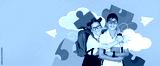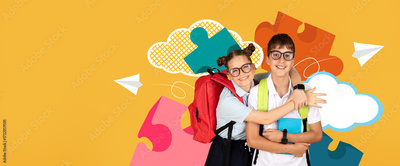 Two children are smiling and embracing, wearing backpacks and glasses. Bright colors and puzzle pieces create a cheerful school atmosphere.