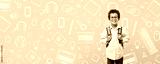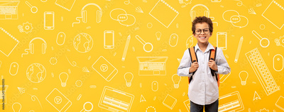 A cheerful child stands in front of a colorful school-themed backdrop, smiling and wearing glasses. The bright yellow background features various educational symbols.