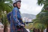 Smiling senior caucasian cyclist woman in leisure activity in urban park riding with electric bike enjoying healthy lifestyle
