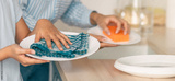 Little housekeeper. Happy pretty asian girl helping mother in kitchen, washing dishes after lunch, smiling together at camera. Cute child learning domestic chores with young mom at home