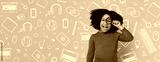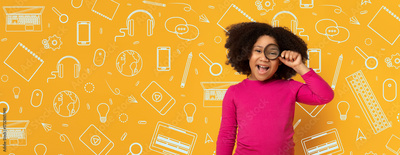 A young child smiles while holding a magnifying glass against a bright background filled with school-related graphics. The playful moment captures the excitement of learning and discovery at school.