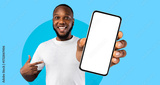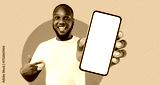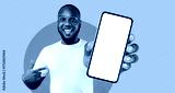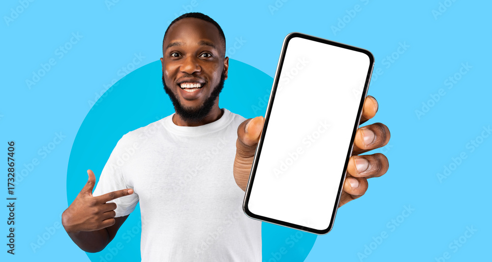 A joyful man stands against a bright blue background, proudly holding up a blank smartphone. He points to the device with enthusiasm, inviting attention and engagement.