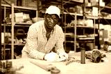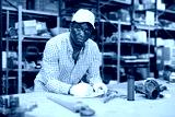 Portrait of african-american man storehouse worker standing at workbench and writing, making notes.