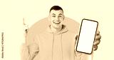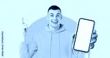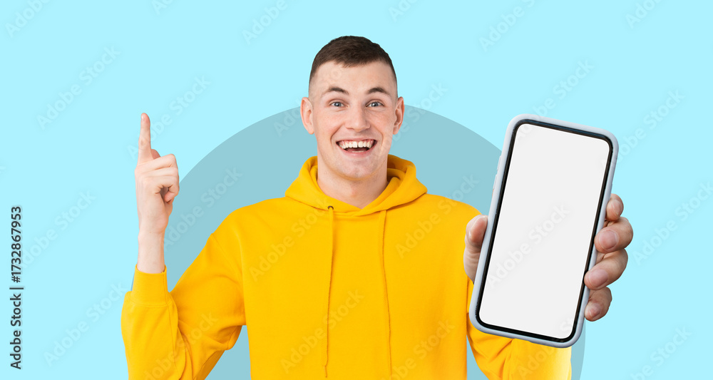 A young man with short hair smiles widely while holding a smartphone in his hand. He wears a bright yellow hoodie and stands against a light blue backdrop, looking excited.