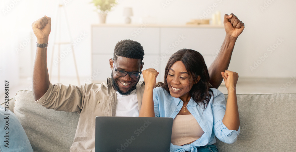 Yeah. Emotional excited black couple celebrating online win, great deal or business success, using pc, cheerful lady and guy raising shaking clenched fists and looking at screen sitting on the couch