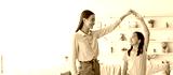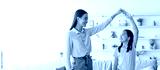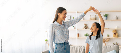 Cheerful asian mother and daughter dancing to music, holding hands and enjoying spending time together, having fun in living room interior at home. Full length shot