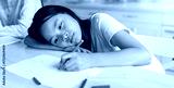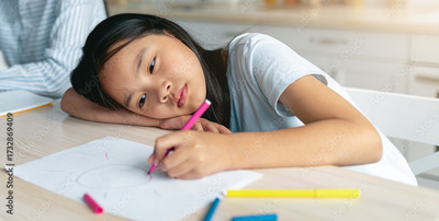 Boredom concept. Busy mom working remotely at home and ignoring her little daughter, kid feeling bored and lonely, drawing on paper. Asian mother and daughter sitting in kitchen