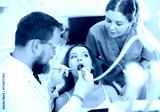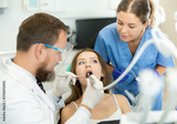 Girl is sitting in armchair during dental treatment at dentist appointment. Man doctor performs procedure of restoration and improvement of teeth, uses technological device