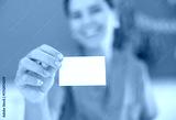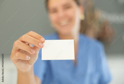 Woman administrator of dental clinic holding blank business card close up in her hands