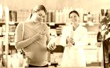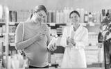 Pregnant woman in pharmacy scans QR code on antifungal cream product, checks certificate on manufacturers website. Girl pharmacist offer similar product in background.