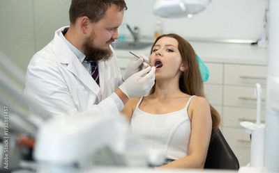 Male dentist delicately checks teeth of a young woman with the help of instruments. European woman came to the dentist office for a dental check and caries prevention