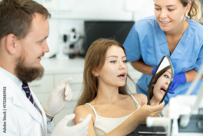 Interested young woman sits in a dentist chair and carefully looks at her teeth in the mirror. Male dentist with an assistant shows the client the work done