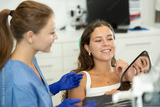 Happy girl admires her snow-white smile in the mirror. Female dentist helps her