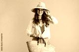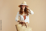 Beach vacation. happy modern 40 years old housewife in white blouse and shorts isolated on beige background in eyeglasses with straw bag and summer hat.