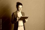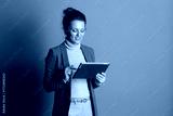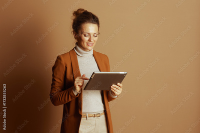 A smiling businesswoman in a brown blazer and beige turtleneck points at a digital tablet held horizontally. Her engaged focus and professionalism convey modern communication and online learning
