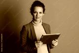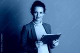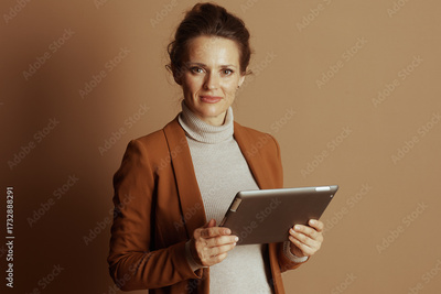 A confident businesswoman with smile holds digital tablet horizontally, looking directly at the camera. Her warm-toned blazer and modern ambiance convey professional elegance and digital expertise