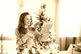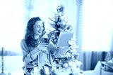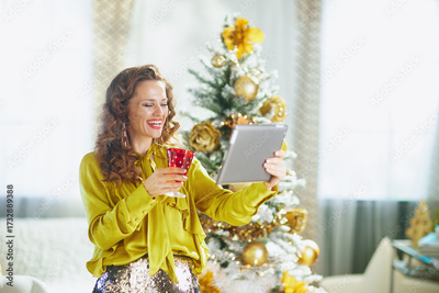 An elegant woman in yellow satin blouse and sparkly sequined skirt smiles, holding tablet and festive red drink. She enjoys video call near beautifully decorated Christmas tree with fairy lights