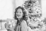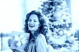 A cheerful woman with curly brown hair and red lipstick laughs with closed eyes, holding glittery gold gift box with star-patterned ribbon. A blurred Christmas tree adds to festive, joyful atmosphere