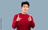 I Pick You. Portrait of young asian guy in red sweater pointing index fingers at camera, posing isolated over pastel studio background wall. Positive smiling man choosing and indicating