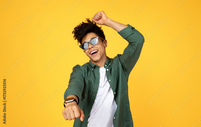 Carefree stylish young black guy wearing sunglasses with smart watch on his wrist dancing and singing isolated on yellow studio background, have fun, enjoying holiday or vacation