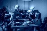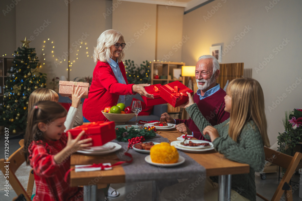 Grandparents giving christmas gifts to children during holiday dinner