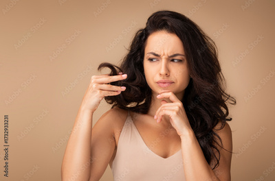 Sad brunette young woman holding her long hair split ends in hand and touching chin isolated on beige background, need for mask treatment, diet correction, balm, vitamins, copy space