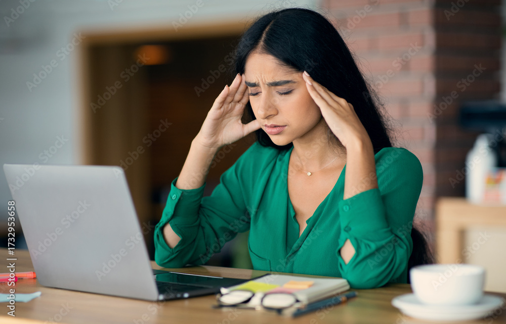 A young woman wearing a green blouse expresses frustration as she works on her laptop inside a cozy coffee shop. She clutches her head as she navigates through her tasks, appearing overwhelmed.