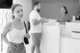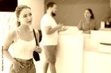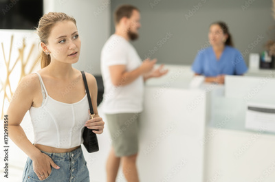 Young girl in the lobby of a modern dental clinic near the reception desk