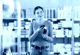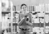 Positive young woman scanning barcode on bottle of syrup held in hand in drugstore