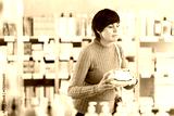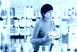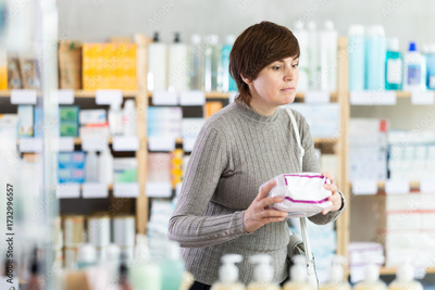 Woman in autumn clothes chooses feminine pads in a supermarket