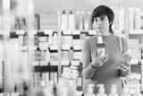 Female shopper chooses best mouthwash in supermarket