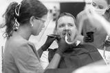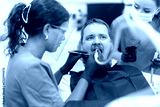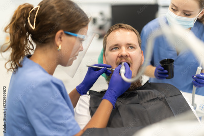 Woman dentist and a nurse carefully drill the tooth of a worried man, they remove caries and prepare the tooth for a filling. Man came to treat his teeth