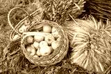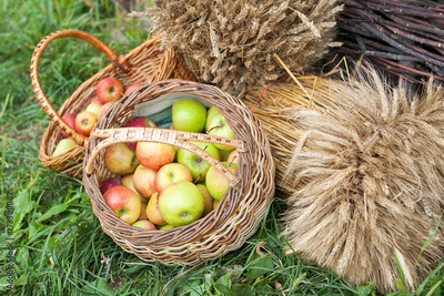 eco lifestyle, countryside, farming concept. in handmaden weaved buskets there are ripe green and red apples, they are standing nearby with bundle of fresh spikes