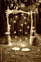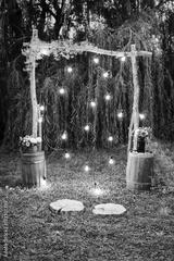 engagement ceremony, love, design concept. in the twilight there is stunning wedding arch decorated in rustic style with twinkle lights and bouquets of various flowers