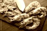 Tasty grilled shrimps with lemon and lettuce on black table, flat lay. Delicious seafood dish