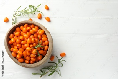 Fresh sea buckthorn berries in bowl and leaves on white wooden table, flat lay. Space for text