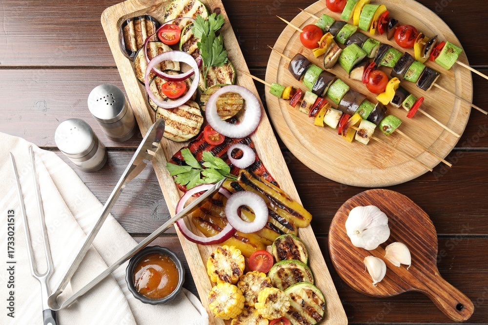 Vegetarian barbecue. Tasty grilled vegetables, spices and sauce on wooden table, flat lay