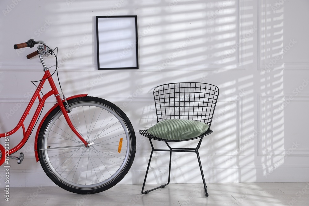 Red bicycle, chair and empty frame on white wall indoors. Space for text