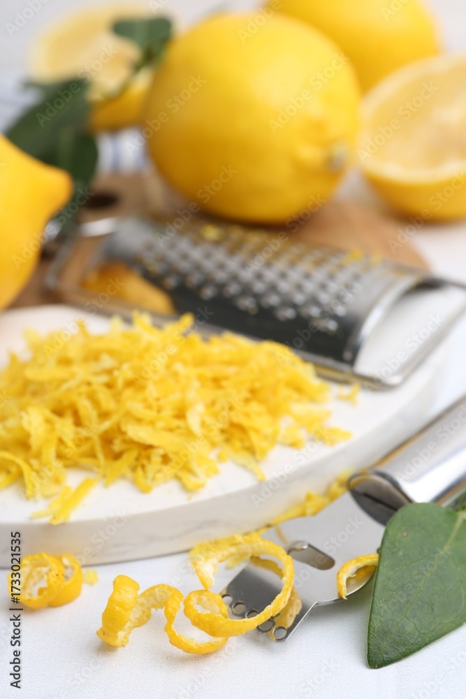 Lemon zest, fresh fruits, tools and green leaves on light table, closeup