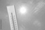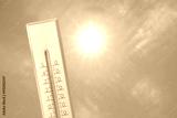 Thermometer showing high temperature against orange sky with bright sun. Extremely hot weather