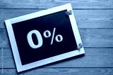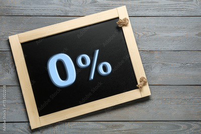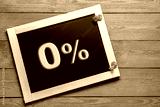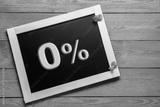 Zero percent commission. Chalkboard with 0% on grey wooden background, top view