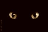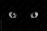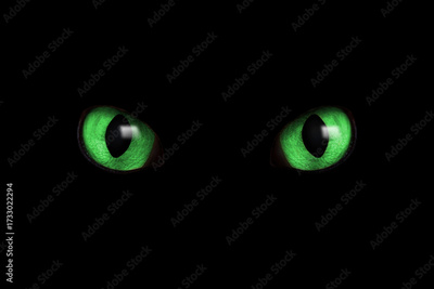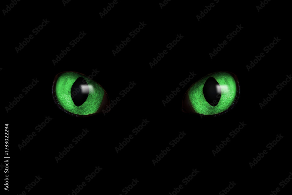 Bright green cat eyes visible in darkness. Halloween vibe
