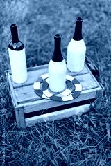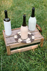 handcraft, summer, vacation concept. three wine and champagne bottles covered by half with white and light pink paints for creating popular game called ringo