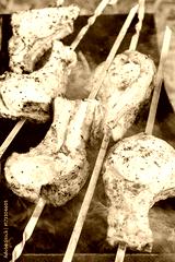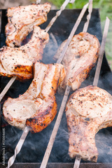 weekends, meals, outdoor party concept. big and succulent pieces of delicious meat seasoned with different spices, they are roasting on the spits for celebrating holidays in the wild