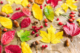 environment, autumn, decoration concept. bloody red rowanberries and healthy rosehip berries placed among bright red and sunny yellow leaves of maples and poplars