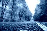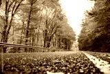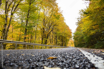 travelling, hitchhiking, environmetal protection concept. long brunches of tall trees hides the light sky under long road that runs through the autumn wood