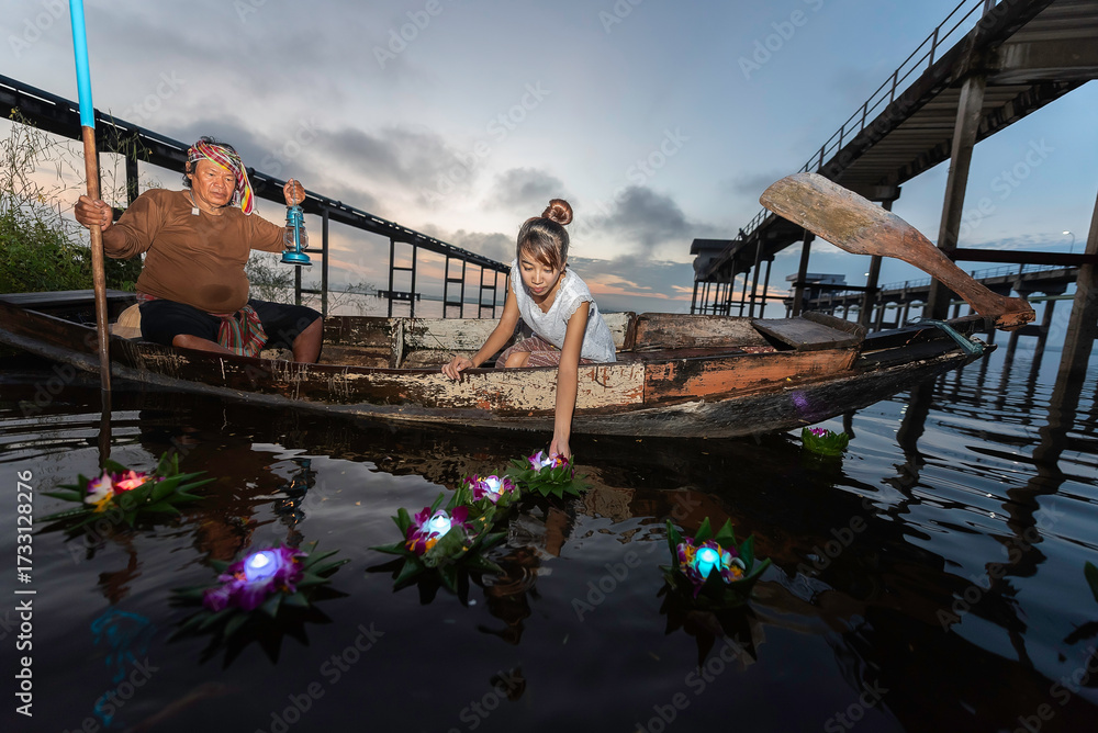 Asia young woman in Thai dress traditional hold kratong, Loy Krathong Day.Loy Kratong Festival