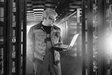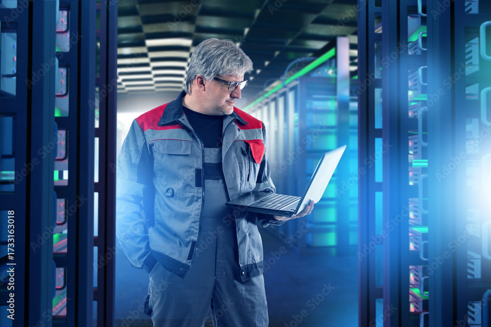 Technician with laptop inspects server racks in data center and monitors IT infrastructure. Work ensures stable network performance, cybersecurity and reliable digital services.