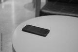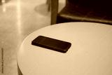 Black smartphone on bright round table in cafe setting